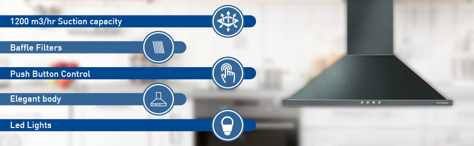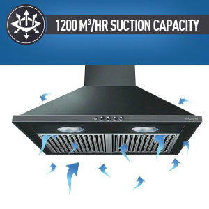 - Size: 60 cm(2-4 burner stove for wall mounted chimneys) | Suction Capacity: 1000 m3/hr(For kitchen size more than 200 sqft and heavy frying/grilling) | Filter Surface Area: 52 x 30 cmsq.