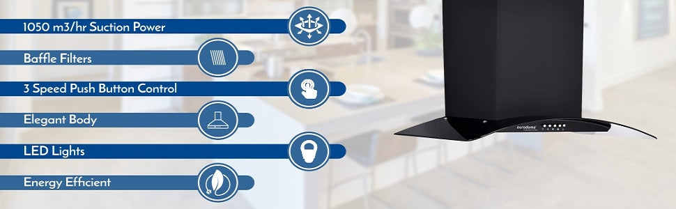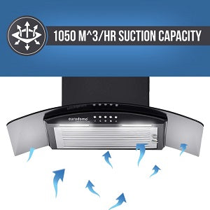 - Size: 60 cm(2-4 burner stove for wall mounted chimneys) | Suction Capacity: 1050 m3/hr(For kitchen size more than 200 sqft and heavy frying/grilling) | Filter Surface Area: 52 x 30 cmsq.